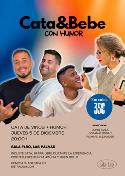 ¡No puedes perderte Cata y Bebe con Humor! En esta noche única, contaremos con tres invitados espectaculares: Jorge Ávila, Doramas Sosa y Richard Alexander, quienes llenarán el evento de humor, diversión y buen rollo.